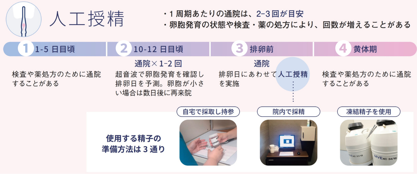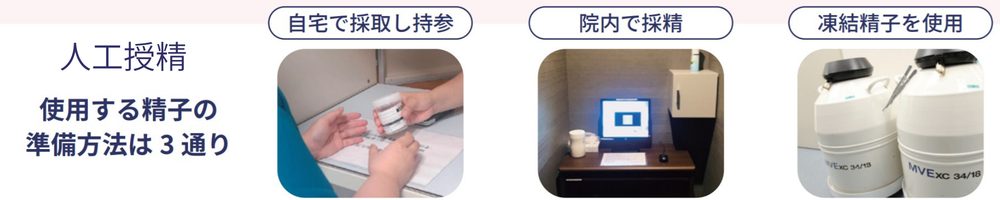 排卵日に合わせて、排卵する前に人工授精を行います。人工授精に使用する精子の準備方法は3通りあり、「自宅で採取し持参する」「院内で採精する」「予め凍結した精子を使用する」のいずれかになります。