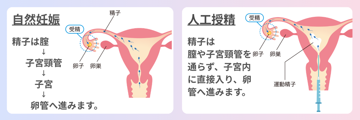 自然妊娠では、精子は腟 → 子宮頸管 → 子宮 → 卵管へと進んでいきますが、人工授精では精子を子宮内に直接注入するため、腟や子宮頸管を通過する過程を省くことができます。