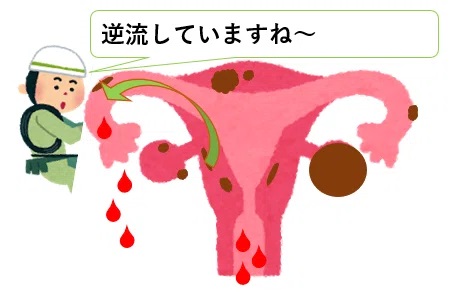月経の時に剥がれ落ちた子宮内膜は下に(腟の方に)排出されるべきところ、逆流してしまう場合があります。その逆流した月経血が卵管を通り卵巣周囲に広がることが原因で子宮の外に子宮内膜組織ができてしまうと考えられています。ただし、これも一つの説で、子宮内膜症の原因や発生機序は未だ解明されていません。