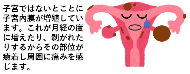 子宮内膜症は、本来は子宮の内側にしか存在しないはずの子宮内膜組織が、子宮以外の場所(卵巣、腹膜など)で増殖、剥離(はくり)を繰り返す病気です。本来は子宮内膜は存在しない場所でそんなことが起こるのですから子宮内膜症が発生している病巣の周りには炎症やそれに伴う癒着がおこり、月経の時でなくても腹部痛や慢性骨盤痛になり、又、排便に伴う痛みの排便痛、性交に伴う痛みの性交痛を起こします。