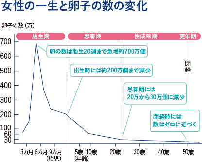 生まれてくるころには、約200万個となり排卵が起こり始める思春期頃には30万個まで減少します。その後、37歳で25,000個、51歳で1,000個となり閉経に至ります。