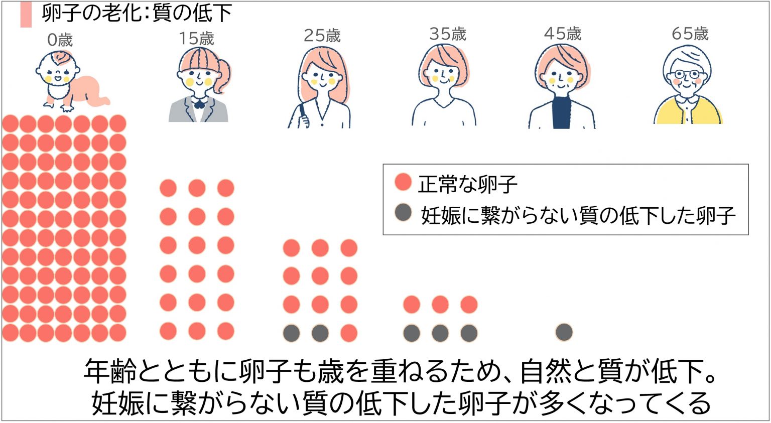 女性の年齢が上がるにつれて卵子の「数」と「質」は徐々に低下し、妊娠の可能性も下がっていきます。特に35歳を過ぎると、妊娠率は低下し流産率が上昇するため、出生率が急激に下がり始め、40歳以降ではさらに顕著です。また、卵子の老化により染色体異常のリスクも高まります。