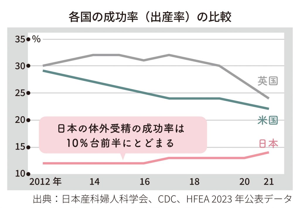 2022年の国内における体外受精の胚移植あたりの妊娠率は36%(出展2)でした。一方、タイミング療法や人工授精では1回あたりの妊娠率は5〜10%前後(出展3)です。この数字からも、体外受精は妊娠率が高い治療法であることがわかります。