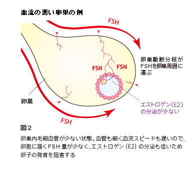 そのような例の多くは、卵巣内血流量が少なく、血流スピードも遅い場合で、体内のFSHホルモンは一部しか卵巣に運ばれないということがあります。
