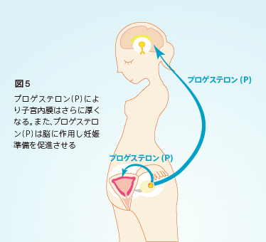 卵胞を育てていた顆粒膜細胞が、排卵後は黄体になりプロゲステロン(P)を分泌します。(図5)