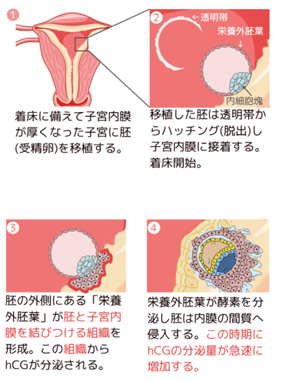 胚移植後、順調に進むと1~2日以内に着床が始まります(イラスト②~③)。そして、hCGは胚と子宮内膜を結び付ける組織から分泌されます(イラスト③)。