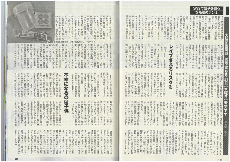 2022年8月週刊現代にてSNSで行われる精子提供について、宮﨑院長が取材におこたえしました。