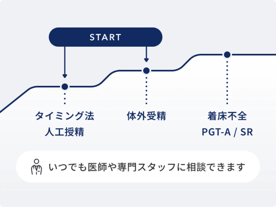 不妊治療は、妊娠しづらい状況に対して原因を取り除いたり、不足を補ったりしながら妊娠の可能性を高める医療です。原因がわからない場合でも、妊娠に近づく方法を選び、進めていきます。