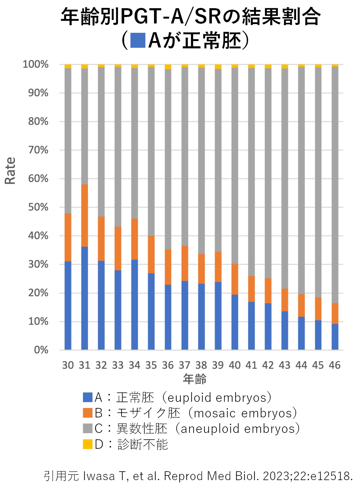 この研究では、正常胚の割合は年齢とともに低下することが明確に示されています。