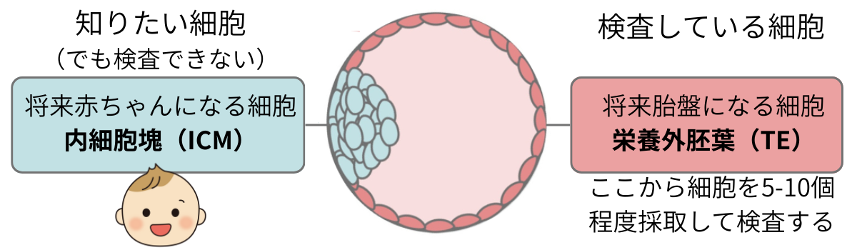 検査では、胚の中の「将来胎盤になる部分」の細胞を5〜10個ほど採取して調べます。胚全体の細胞をすべて調べているわけではありません。そのため、もし別の場所の細胞を採取していた場合、異なる結果になる可能性を完全に否定することはできません。